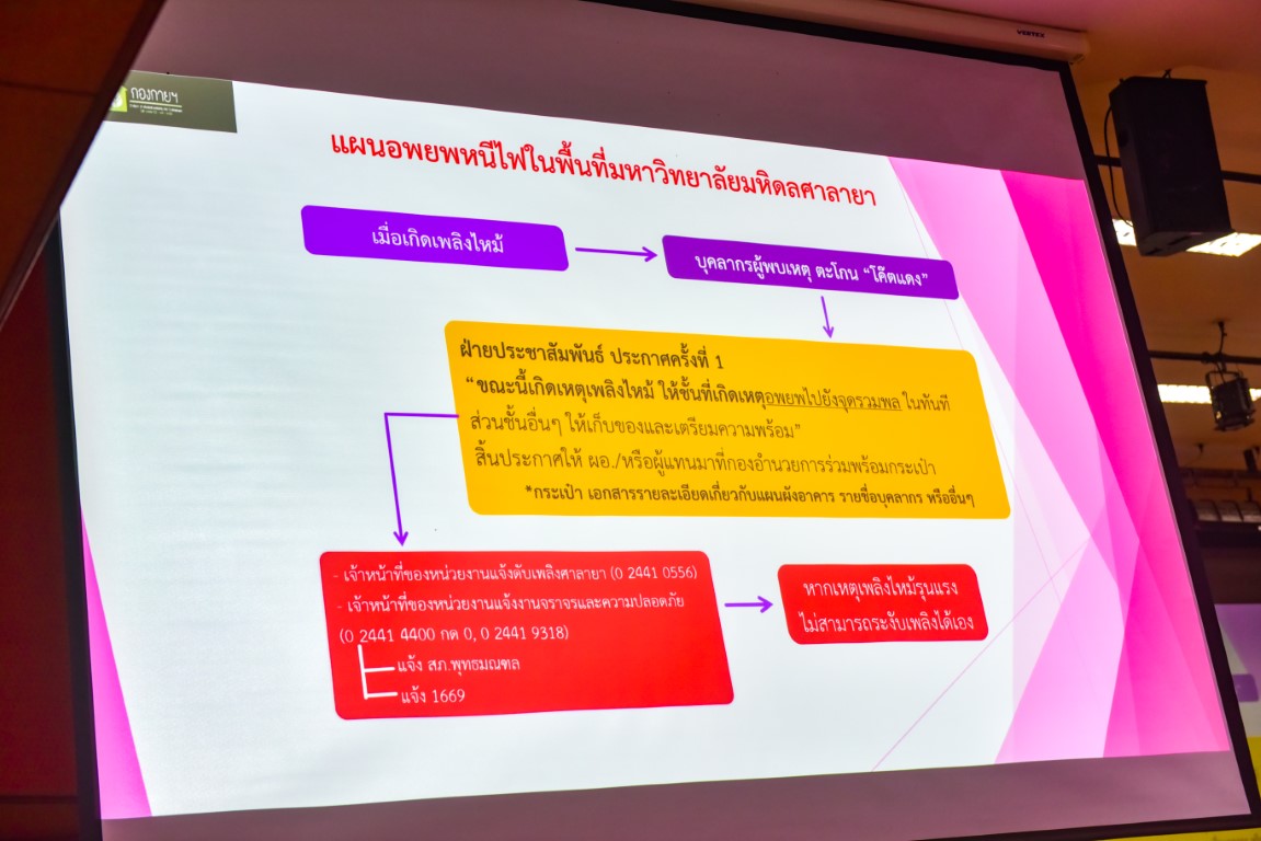 วิทยากรได้ชี้แจงให้ทุกคนเห็นว่า ในภาวะฉุกเฉินนั้นจะมีหน่วยงานใดบ้างที่มีหน้าที่รับผิดชอบ และเมื่อเกิดเหตุการณ์ขึ้นจะต้องอพยพอย่างไร รวมถึงมีการสอนวิธีการใช้ถังดับเพลิง และการปฐมพยาบาลเบื้องต้นด้วย CPR จากนั้น ได้สมมติสถานการณ์ขึ้น เป็นเหตุเพลิงไหม้ ณ ห้องควบคุมระบบภาพและเสียงของหอประชุมพระอุบาลีคุณูปมาจารย์ ในขณะที่ทุกคนร่วมกิจกรรมในหอประชุม ซึ่งทั้งหมดได้รีบลงจากอาคารมายังบริเวณพื้นที่ปลอดภัย (Green Zone) บริเวณจุดกองอำนวยการ ซึ่งใช้เป็นพื้นที่สรุปข้อมูลต่าง ๆ ที่เกี่ยวข้องกับเหตุเพลิงไหม้