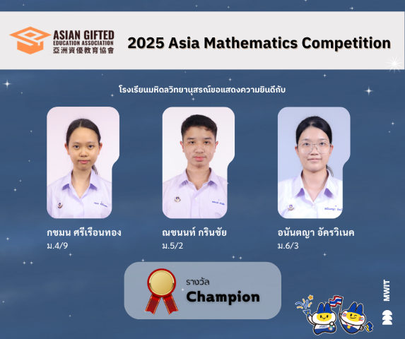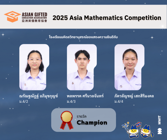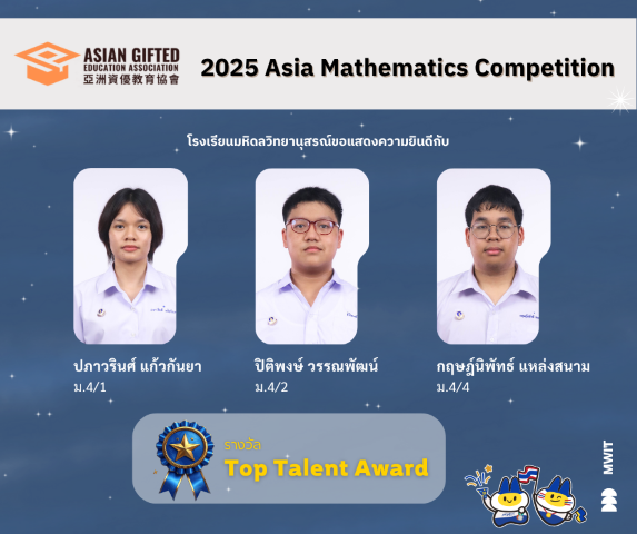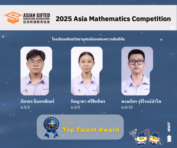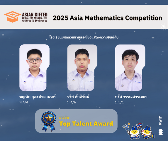 นักเรียนโรงเรียนมหิดลวิทยานุสรณ์รับรางวัลจากเวทีการแข่งขันวิชาการระดับนานาชาติ 2025 Asia Mathematics Competition – Measures of Academic Progress Standard (MAP) ซึ่งจัดโดย Asian Gifted Education (AGEA) เขตบริหารพิเศษฮ่องกงแห่งสาธารณรัฐประชาชนจีน ในรูปแบบออนไลน์ เมื่อวันที่ 5 ตุลาคม พ.ศ. 2568 และประกาศผลไปเมื่อวันที่ 13 ตุลาคม พ.ศ. 2568 ที่ผ่านมา