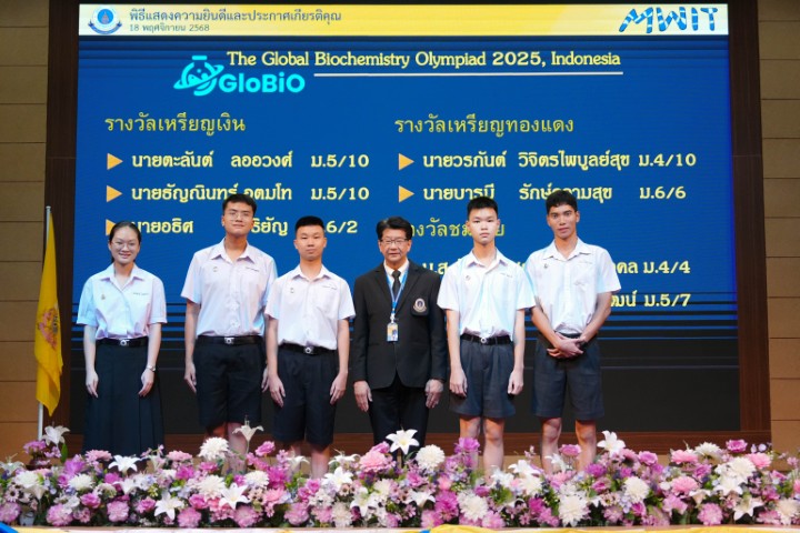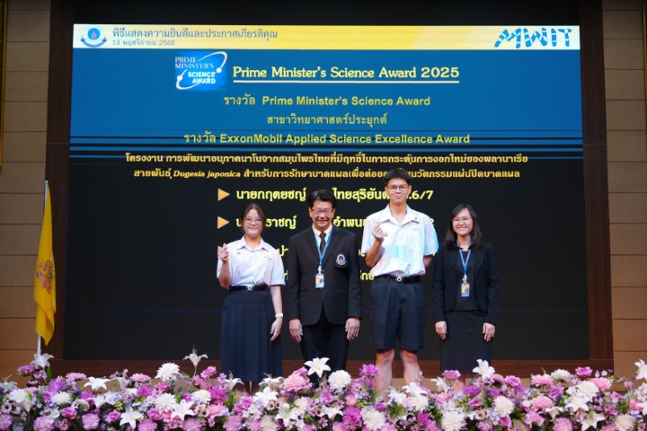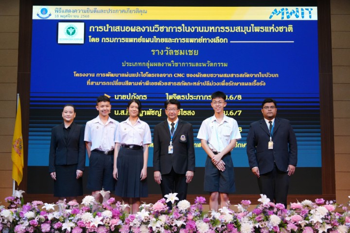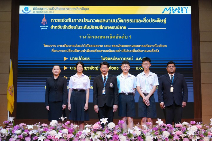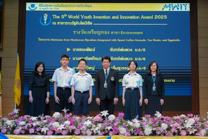 - โครงงานสาขาวิชาชีววิทยาและวิทยาศาสตร์สุขภาพ เรื่อง “Biofoams from Mushroom Mycelium Integrated with Spent Coffee Grounds, Tea Waste, and Eggshells” นำเสนอโดย นายธนะพัฒน์ จันทร์เด่นดวง นักเรียนชั้น ม.6/5 นางสาวทิพย์ไหมทอง จันทร์เด่นดวง นักเรียนชั้น ม.6/6 และ นายปภาวิชญ์ กลิ่นสุวรรณ นักเรียนชั้น ม.6/5 โดยมี อาจารย์ภัทรญา กลิ่นทอง ครูสาขาวิชาชีววิทยาและวิทยาศาสตร์สุขภาพ ร่วมด้วย ดร.นัฐวุฒิ บุญยืน จาก ศูนย์พันธุวิศวกรรมและเทคโนโลยีชีวภาพ และ ผศ.ดร.หนึ่งนิตย์ วัฒนวิเชียร จาก คณะวิทยาศาสตร์ มหาวิทยาลัยมหิดล เป็นที่ปรึกษาโครงงาน ได้รับรางวัลเหรียญทอง สาขา Environment