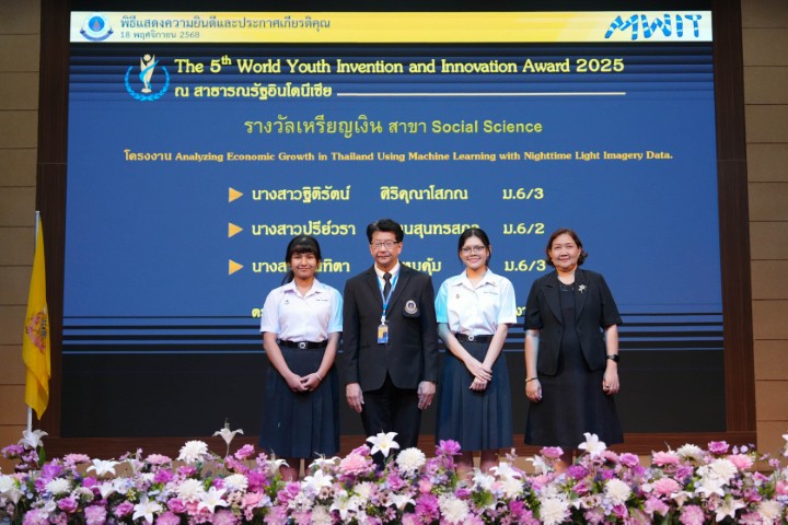 - โครงงานสาขาวิชาศิลปศาสตร์เรื่อง “Analyzing Economic Growth in Thailand Using Machine Learning with Nighttime Light Imagery Data” นำเสนอโดย นางสาวฐิติรัตน์ ศิริคุณาโสภณ นักเรียนชั้น ม.6/3 นางสาวปรีย์วรา วัฒนสุนทรสกุล นักเรียนชั้น ม.6/2 และ นางสาวนันทิตา พรหมคุ้ม นักเรียนชั้น ม.6/3 โดยมี ดร.สิริรัตน์ พงศ์พิพัฒนพันธุ์ ครูสาขาวิชาศิลปะศาสตร์ เป็นที่ปรึกษาโครงงาน ได้รับรางวัลเหรียญเงิน สาขา Social Science