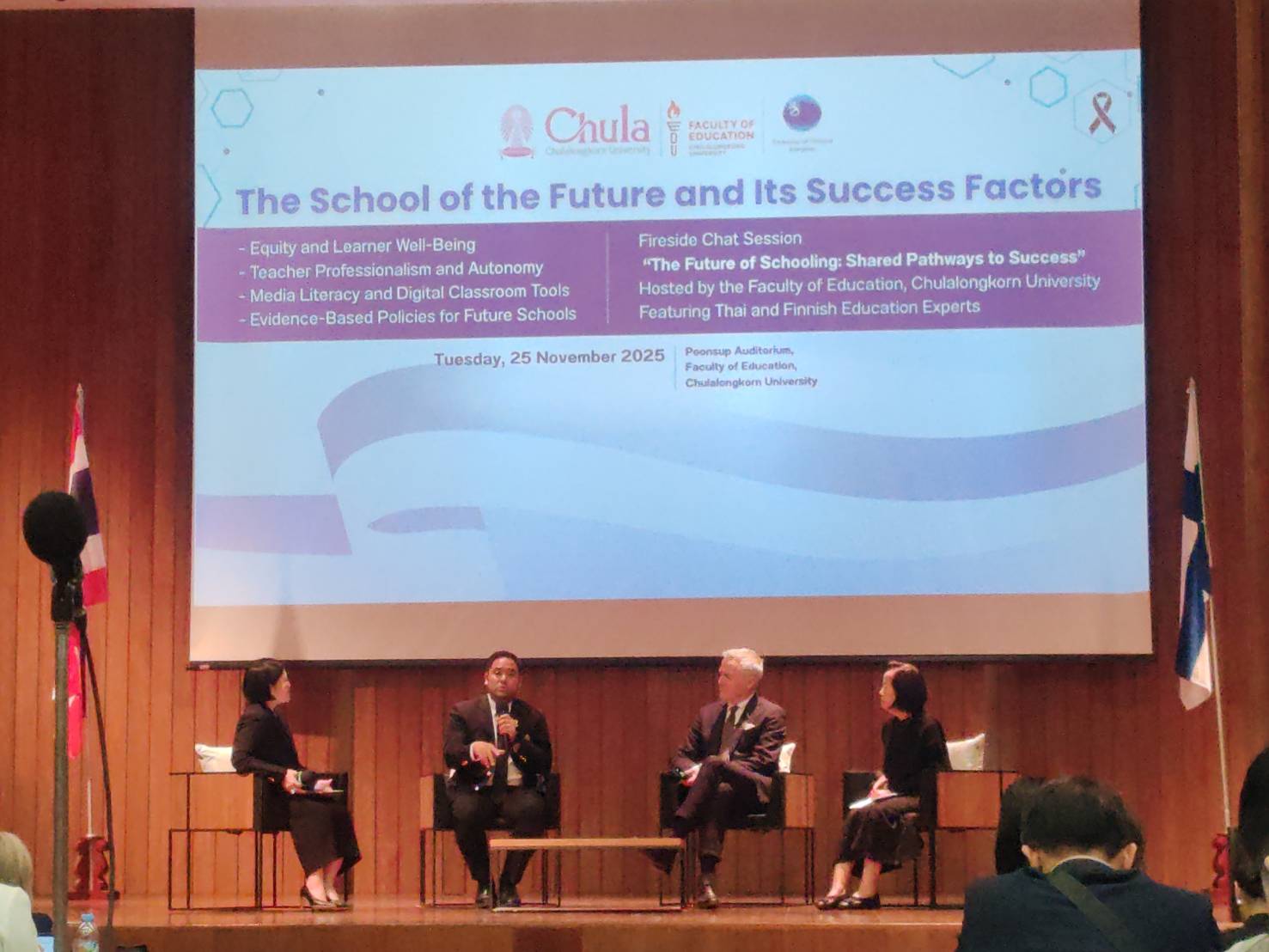 ภายหลังการบรรยาย มีการเสวนาแลกเปลี่ยนความคิดเห็นในรูปแบบ “Fireside Chat: The Future of Schooling – Shared Pathways to Success” โดยมีคณบดีคณะครุศาสตร์ จุฬาลงกรณ์มหาวิทยาลัย และผู้ทรงคุณวุฒิด้านการศึกษาในประเทศไทยร่วมเป็นวิทยากร