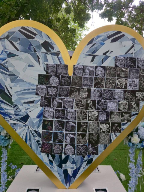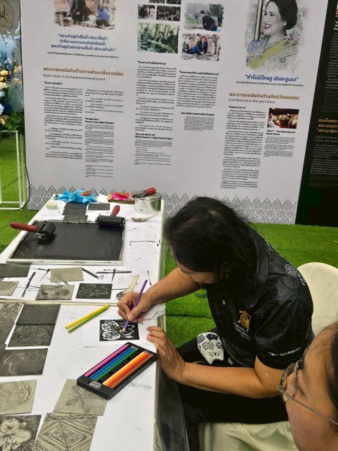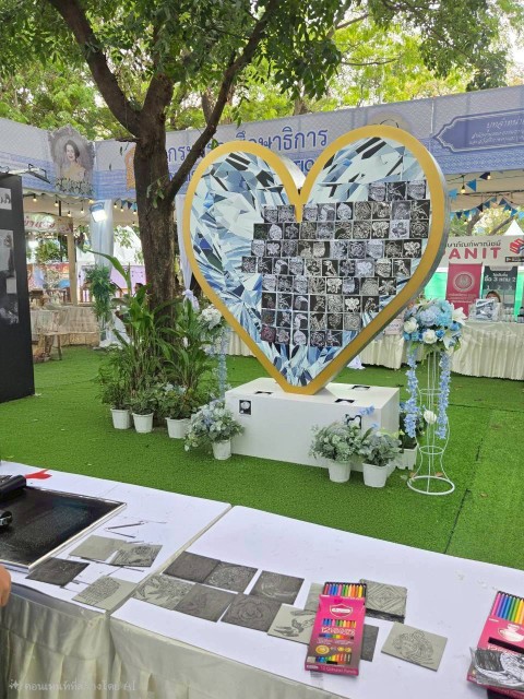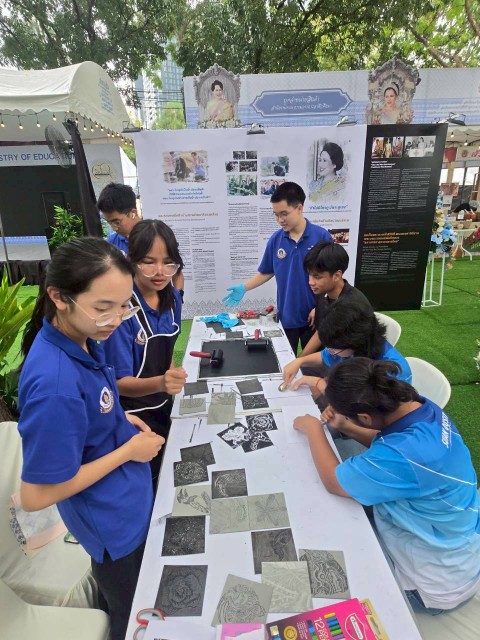 การจัดแสดงนิทรรศการ โรงเรียนได้นำเสนอในรูปแบบกิจกรรมศิลปะแบบมีส่วนร่วม (Participatory Art) เปิดพื้นที่ให้ผู้เข้าร่วมงานได้สร้างสรรค์ผลงานจากแม่พิมพ์ที่แกะลวดลายบนกระเบื้องยางที่นักเรียนจัดทำขึ้น โดยอ้างอิงจากพระราชกรณียกิจสำคัญ อาทิ โครงการบ้านเล็กในป่าใหญ่ การอนุรักษ์โขน การอนุรักษ์พันธุ์เต่าทะเล โครงการด้านการศึกษาประวัติศาสตร์ไทย ฯลฯ ผู้เข้าร่วมงานสามารถนำแม่พิมพ์ลงหมึก พิมพ์ลงบนกระดาษ และนำผลงานไปติดบนแผงนิทรรศการรูปหัวใจ สื่อถึงการ “ร้อยดวงใจ” ของพสกนิกรที่มีต่อพระองค์ท่าน