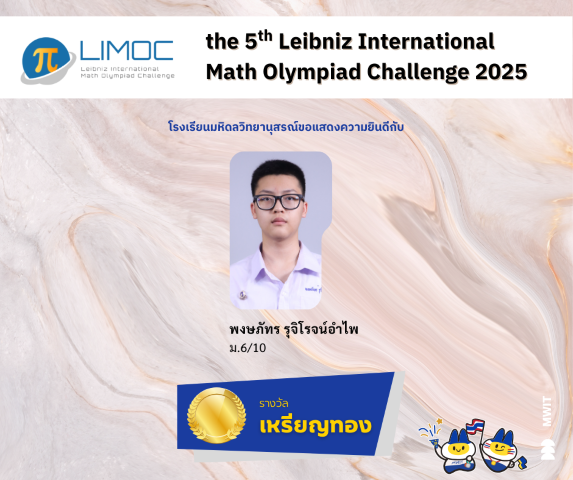 the Leibniz International Math Olympiad Challenge (LIMOC) เป็นเวทีการแข่งขันคณิตศาสตร์ระดับนานาชาติที่มุ่งส่งเสริมทักษะการคิดเชิงวิพากษ์และการแก้ปัญหาที่ซับซ้อน เปิดโอกาสให้นักเรียนที่มีความสามารถโดดเด่นด้านคณิตศาสตร์ได้แสดงศักยภาพทางวิชาการอย่างเป็นระบบ โดยในปีนี้มีผู้ผ่านเข้าสู่รอบคัดเลือกจำนวน 33 คน จาก 7 ประเทศ ได้แก่ รัฐพหุชนชาติแห่งโบลิเวีย สาธารณรัฐโบลีวาร์แห่งเวเนซุเอลา สหรัฐเม็กซิโก สหพันธรัฐมาเลเซีย สาธารณรัฐฟิลิปปินส์ สาธารณรัฐอินโดนีเซีย และประเทศไทย