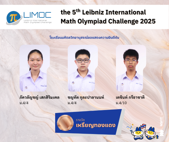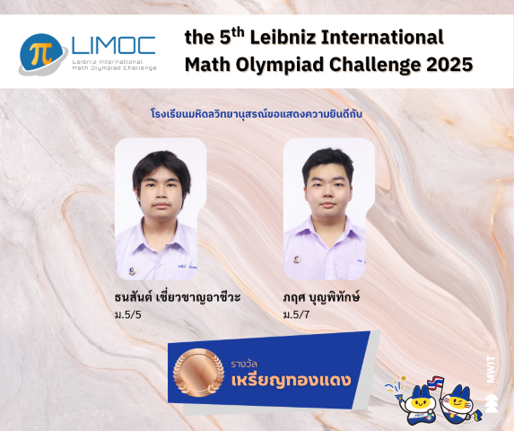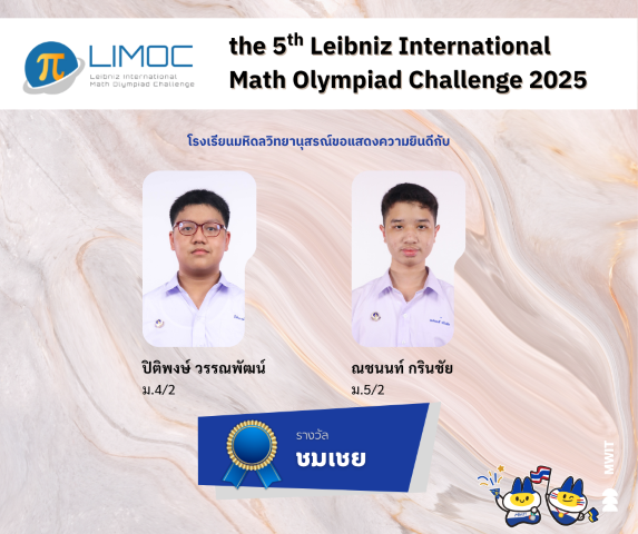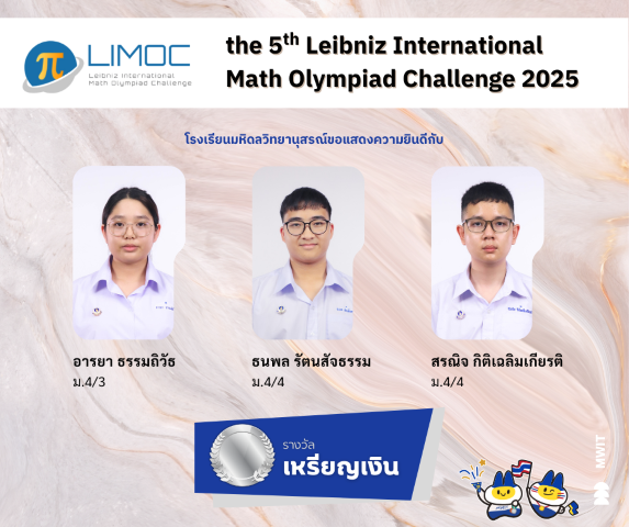 นักเรียนโรงเรียนมหิดลวิทยานุสรณ์รับรางวัลจากการแข่งขันวิชาการระดับนานาชาติรูปแบบออนไลน์ในงาน the 5th Leibniz International Math Olympiad Challenge (LIMOC) 2025 จัดโดย Organizing Center for STEM Olympiad (OCSO) สาธารณรัฐอินโดนีเซีย ซึ่งจัดการแข่งขันเมื่อวันที่ 22 และ 29 พฤศจิกายน พ.ศ. 2568