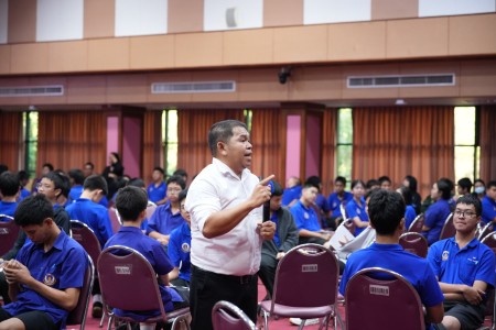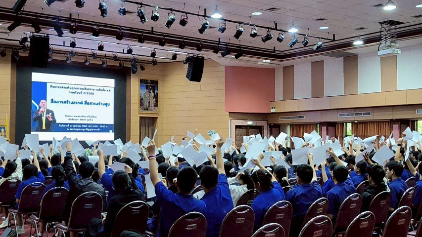 ขณะที่กิจกรรมของนักเรียนระดับชั้น ม.5 จัดขึ้นภายใต้หัวข้อ “สื่อสร้างสรรค์ เสริมสร้างคุณธรรม” โดยให้นักเรียนรับชมสื่อวิดีโอที่สะท้อนประเด็นทางสังคมในหลากหลายมิติ พร้อมเปิดพื้นที่การเรียนรู้ผ่านการแลกเปลี่ยนความคิดเห็นร่วมกันในช่วงท้ายของแต่ละคลิป เพื่อส่งเสริมการคิดวิเคราะห์ การแสดงออกอย่างมีเหตุผล และการเรียนรู้คุณค่าทางจริยธรรมผ่านสื่ออย่างสร้างสรรค์