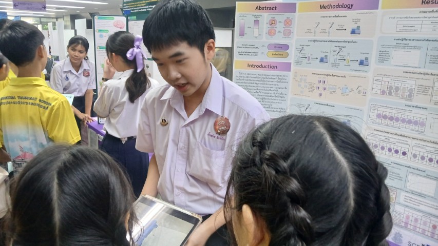 - โครงงานเรื่อง “การออกแบบจำลองเชิงคำนวณเพื่อพัฒนาไบโอเซนเซอร์จากแอนติบอดีที่ปรับลำดับกรดอะมิโน พร้อมการเติมซิสเทอีนที่ปลายสายโซ่ของแอนติบอดีเพื่อการตรึงบนทองคำสำหรับการตรวจวินิจฉัยโปรตีน Tau ที่เกิดภาวะ Hyperphosphorylation ซึ่งเป็นตัวบ่งชี้ชีวภาพของโรคอัลไซเมอร์” ผลงานของ นายธนสันต์ เชี่ยวชาญอาชีวะ นักเรียนชั้น ม.5/5 นายนิธาน เรามานะชัย นักเรียนชั้น ม.5/5 และ นายธรรศธรณ์ ภูมิมาศ นักเรียนชั้น ม.5/9 โดยมี ดร.เกียรติภูมิ รอดพันธ์ ครูสาขาวิชาเคมี เป็นที่ปรึกษาโครงงาน