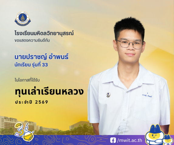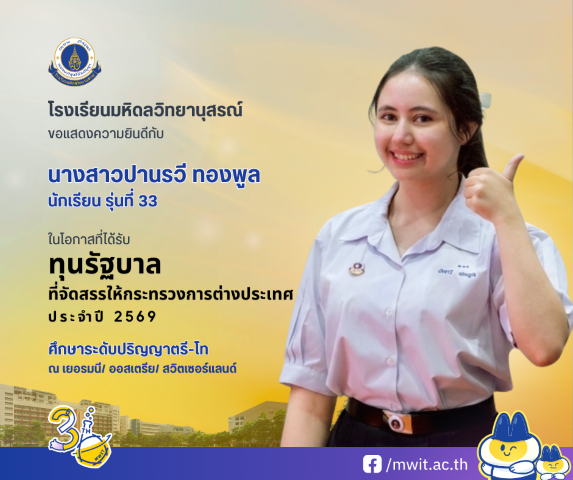 โรงเรียนมหิดลวิทยานุสรณ์ขอแสดงความยินดีกับนักเรียนรุ่นที่ 33 ที่ได้รับทุนรัฐบาลเพื่อศึกษาต่อในต่างประเทศ ประจำปี 2569 จำนวน 2 คน ซึ่งสะท้อนถึงศักยภาพของนักเรียนที่ปรากฎเด่นชัด ได้แก่