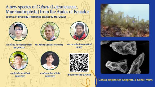 ครูและนักเรียนโรงเรียนมหิดลวิทยานุสรณ์ ร่วมค้นพบพืชชนิดใหม่ของโลกในสกุล Colura โดย ดร.จิโรจน์ แสงรัตนประเสริฐ ครูสาขาวิชาชีววิทยาและวิทยาศาสตร์สุขภาพ พร้อมด้วย นายธีร์ธวัช อาวพิทักษ์ นักเรียนรุ่นที่ 33 และ นายติณณภัชน์ ศรีเพ็ง นักเรียนรุ่นที่ 31 ร่วมกับ Mr. Alfons Schäfer-Verwimp นักวิจัยชาวเยอรมัน และ รศ.ดร.สหัช จันทนาอรพินท์ จากสาขาวิทยาศาสตร์ชีวภาพ คณะวิทยาศาสตร์ มหาวิทยาลัยสงขลานครินทร์ ได้ตีพิมพ์งานวิจัยการค้นพบพืชชนิดใหม่ของโลก เรื่อง “A new species of Colura (Lejeuneaceae, Marchantiophyta) from the Andes of Ecuador” ในวารสารวิชาการนานาชาติด้านพฤกษศาสตร์ Journal of Bryology
